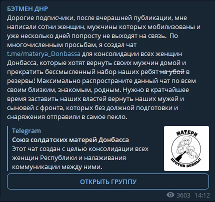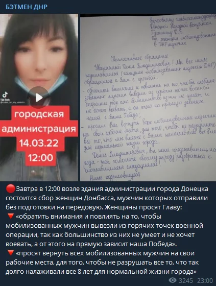 13.03.2022 года Телеграм канал «БЭТМЕН ДНР», автор которого является сотрудником 72-й ЦИПсО Украины опубликовал ту же самую информацию, с точно такой же формулировкой, что и в чатах, об общем собрании возле Областной городской администрации г. Донецка в 12:00.